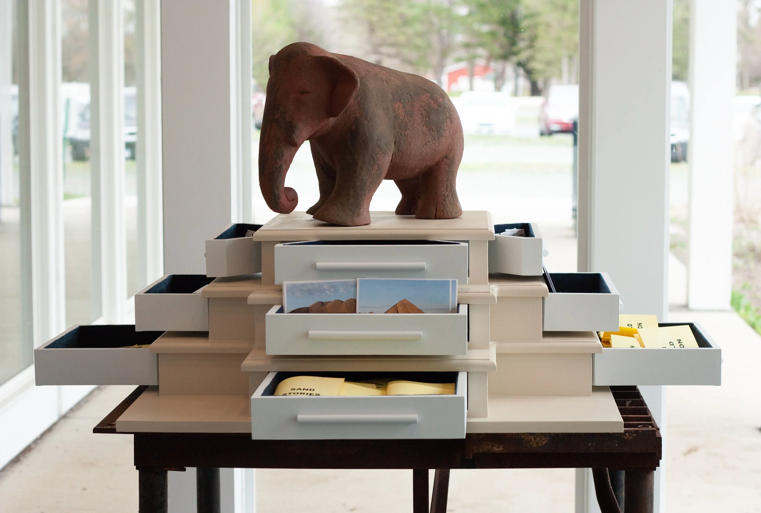 At the centre of the work is an elephant made from foraged Franconia clay and coated with sand from the St. Croix River. The elephant stand over the assemblage of objects as a symbol of acknowledgement. AS a creature in captivity, it also encourages the viewer to experience the work with empathy and understanding. Its figure draws from the colloquial phrase, “I’ve seen the elephant,” which represents the idea that by seeing something so out of the ordinary, one can gain a sense of worldliness.